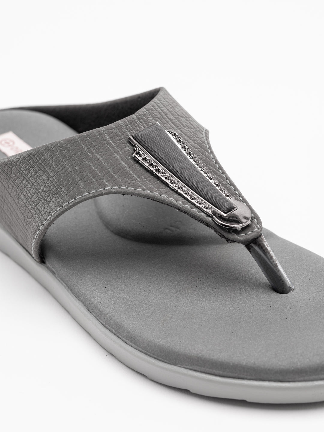 ORTHO TREND Polyvinyl Chloride Women's Footwear: Stylish grey flat sandals with a faux leather finish, featuring a convenient hook and loop closure, cushioned arch support, and a soft outer sole for all-day comfort. Perfect for casual wear, these shoes are designed for a secure fit and stylish look.